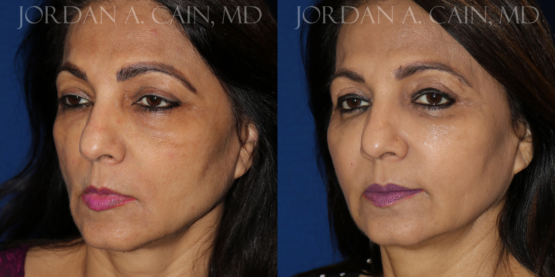 Patient underwent upper and lower blepharoplasty (eyelid surgery) with fat grafting to the lower eyelid and upper cheek regions to rejuvenate the area around the eyes and provide a more youthful and rested appearance. Results are shown approximately 4 months after surgery.
