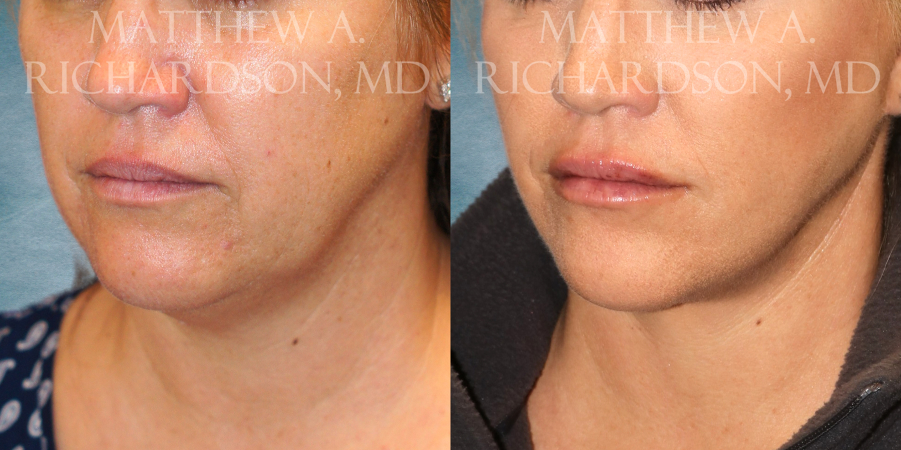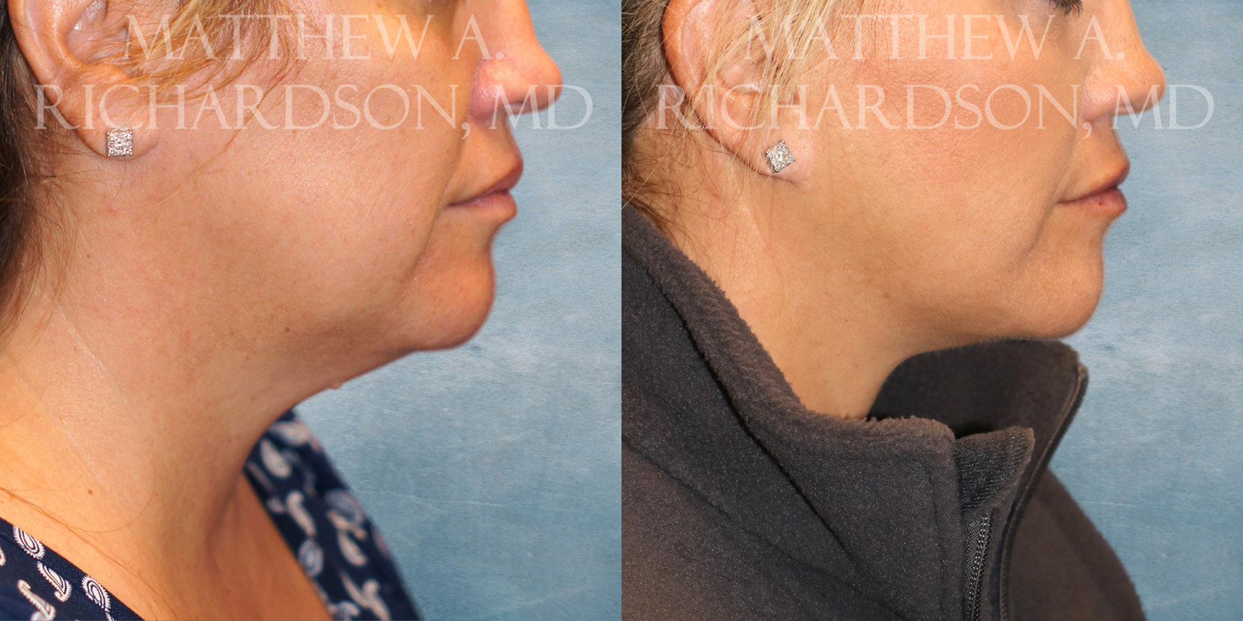 Patient treated with cheek and neck lift, endoscopic brow lift, and transfer of SMAS tissue into the nasolabial folds and marionette lines. Post-op photos taken at 3 months. Note the improvement in the cheeks, jawline, neck, and brow position without any noticeable scarring.