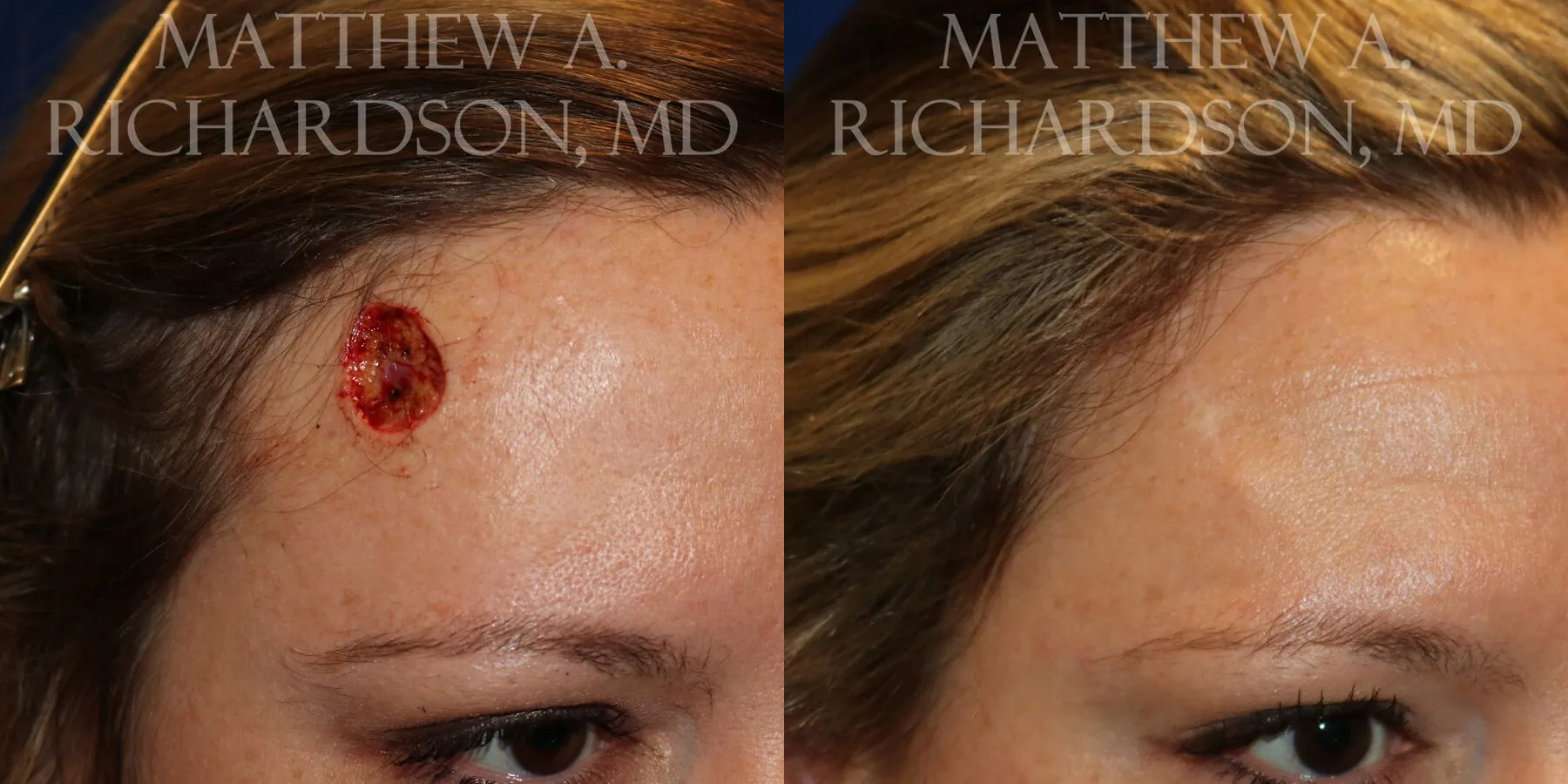 Skin cancer defect of the forehead after the dermatologist performed Mohs surgery.