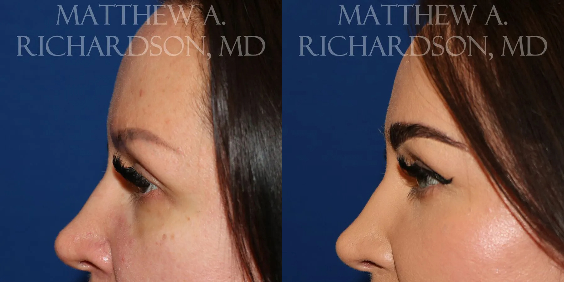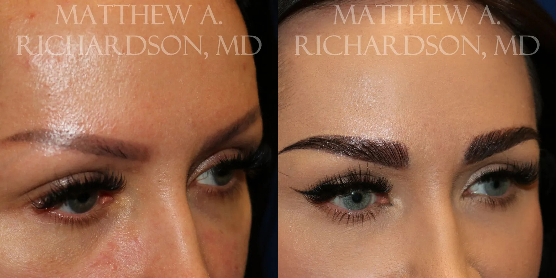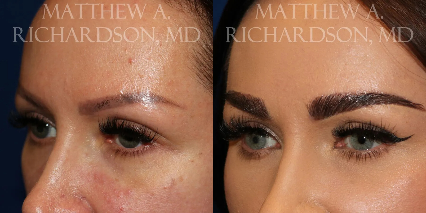 Patient who an eyebrow transplant, to thicken and give more definition to the eyebrows. Results are shown approximately 5 months after the procedure.