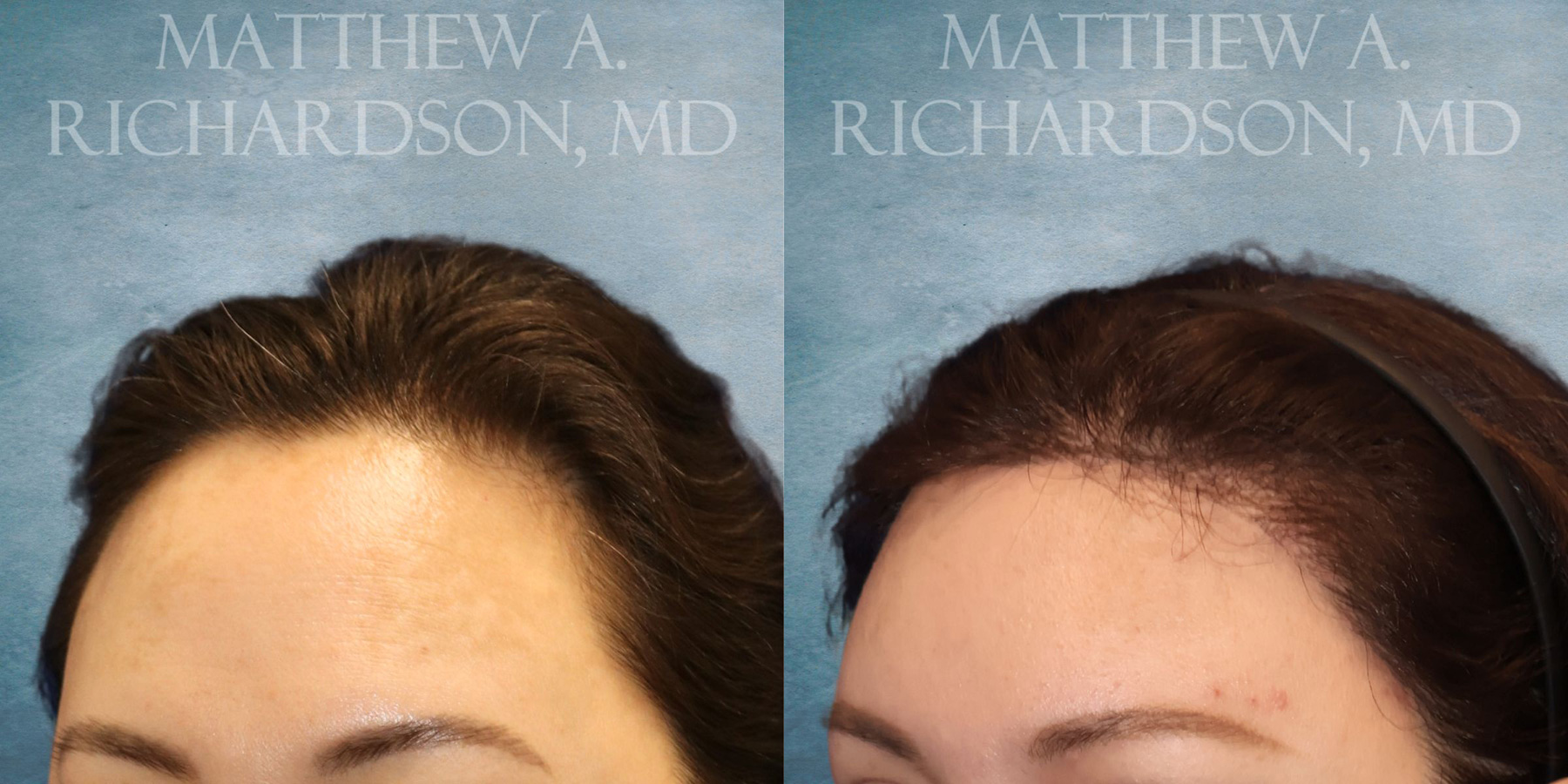 1 Year and 11-month postoperative views of Forehead Reduction and Hair Transplant. Procedure performed by Dr. Matthew Richardson, MD.