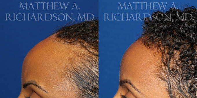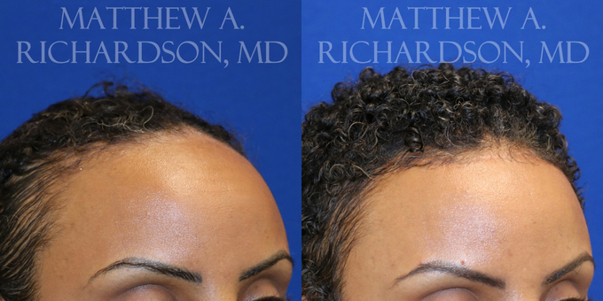 1 month postoperative views of a forehead reduction patient. Scar is barely visible but will fade even more over time as hair grows through the incision.