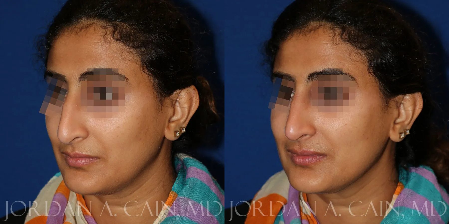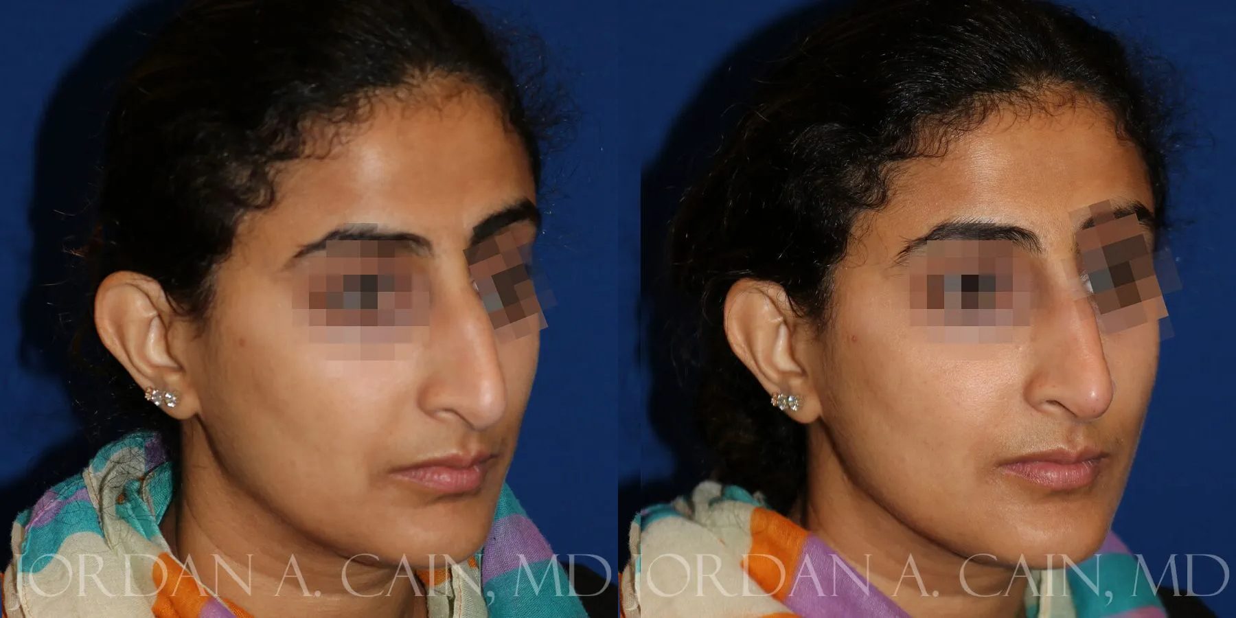Patient underwent non-surgical nose job with filler injection to conceal a prominent dorsal hump and elevate a “drooping” tip.