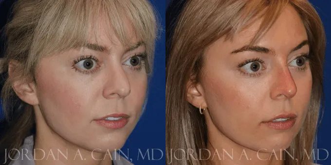 Patient underwent nonsurgical nose job to refine the dorsum and nasal tip.