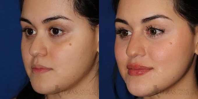 Young woman who desired non-surgical nose changes in order to reduce the appearance of a dorsal hump and a hanging tip. Vollure was used to smooth the profile, add definition to the tip of the nose where prominent cartilages were noted pre-procedure, and give the appearance of rotating the tip upwards.