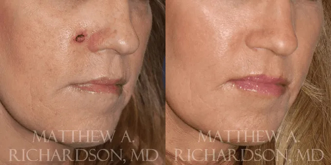 Repair of a facial skin defect from a skin cancer that was removed with Mohs micrographic surgery and then sent to us for reconstruction. An adjacent tissue transfer (V to Y flap) was used for reconstruction. Scar will continue to fade over time.